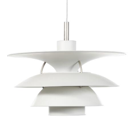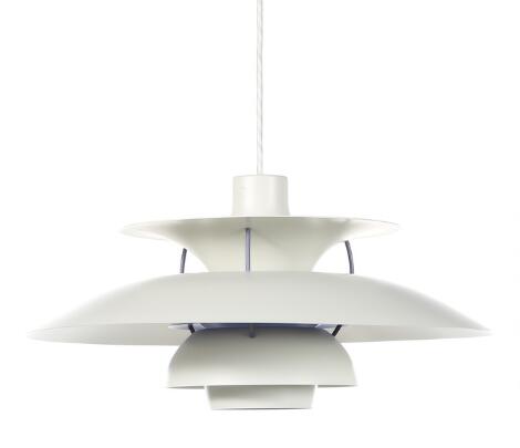 2546/912Poul Henningsen: "PH-5". Fem pendler med skærme af hvidlakeret metal. Udført hos Louis Poulsen. Diam. 50. (5)