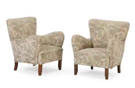 2546/729Danish furniture design: A pair of easy chairs with beech legs, upholstered with flowered fabric. 1940s. (2)