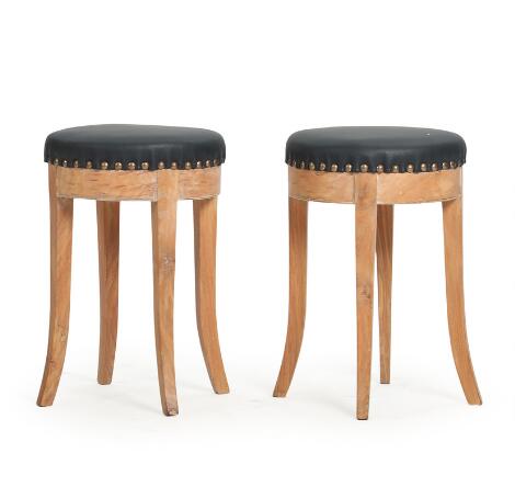 2546/734Danish furniture design: Pair of elm stools, upholstered in black leather fitted with brass nails. 1940s-50s. (2)