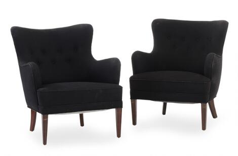 2546/546Frits Henningsen: Et par lænestole med ben af mahogni, betrukket med sort stof. (2)