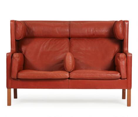 2546/521Børge Mogensen: "Kupé". To-personers sofa med ben af teak, betrukket med brunt skind. Model 2192. L. 154.