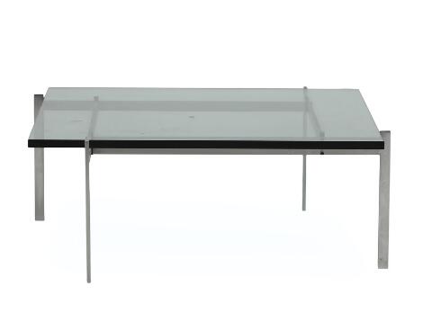 2546/524Poul Kjærholm: "PK 61". Kvadratisk sofabord af stål, plade af glas. Udført hos Fritz Hansen. H. 32,5. L./B. 80.