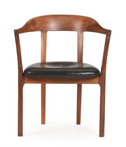 2546/542Ole Wanscher: Armstol af riopalisander, betrukket i sæde med sort skind. Udført hos A.J. Iversen. 1960'erne.