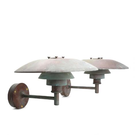 2546/576Poul Henningsen: "PH 4,5/3". Et par udendørs væglamper af patineret kobber. Udført hos Louis Poulsen. Diam. 45. (2)