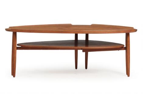 2546/563Arne Vodder: Tre-sidet sofabord af teak med underliggende hylde, opsat på seksbenet stel. H. 50. L. 134. B. 84 cm.
