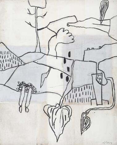 2546/535Lars Physant: "Udenfor", 1993-1996. Signeret med titel og datering på bagiden. Mixed media på plade. 49,5 x 65 cm.