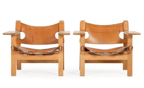 2546/515Børge Mogensen: “The Spanish Chair”. A pair of solid oak armchairs. Seat and back with patinated natural full grain leather. (2)