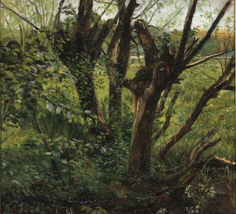 Dansk maler, 19. årh.: Parti fra udkanten af en skov. Sign. A. L. 84. Olie på lærred. 40 x 43,5.