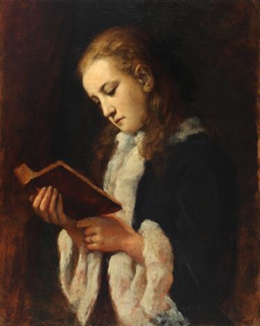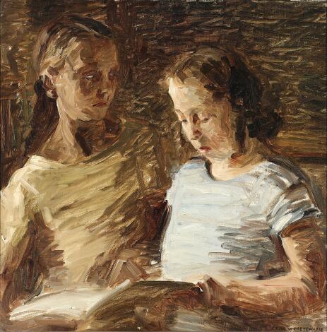 Carl V. Meyer: To piger, der læser. Sign. Carl V. Meyer. Olie på lærred. 53 x 53 cm.