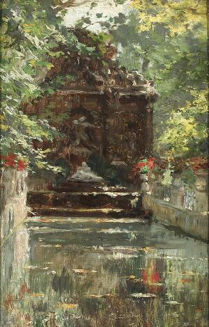 Ubekendt maler, 19. årh.: En fontæne omgivet af røde blomster og frodigt løv. Sign. monogram. Olie på lærred monteret på malepap. 23,5 x 15,5 cm.