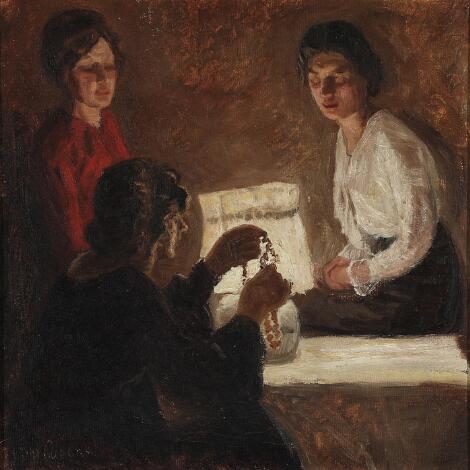 Christian Aigens: Tre kvinder betragter en halskæde i lampens skær. Sign. Chr. Aigens. Olie på lærred. 51,5 x 50,5 cm.