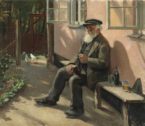 Carlo Hornung Jensen: En gammel mand nyder solen på en gårdsplads. Sign. C. Hornung Jensen 1921. Olie på lærred. 60 x 70 cm.