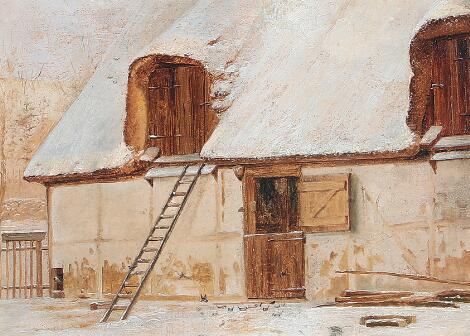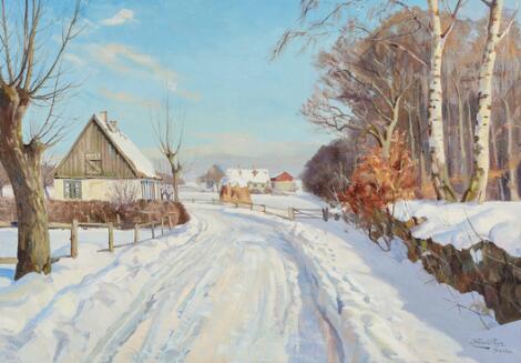 L. A. Schou: ”Fra Ferslev Præstegaard. Vinter”. Usigneret. Olie på malepap. 15 x 21.