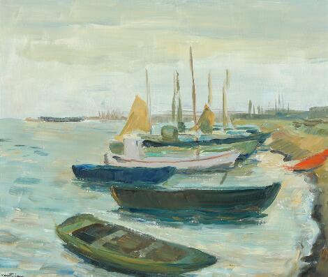 Carl Fischer: Kystparti med fiskerbåde. Sign. Carl Fischer. Olie på lærred. 55 x 64.