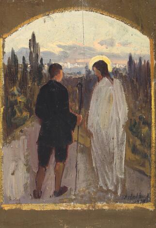 Niels Holbak: Religiøs scene med jesus og en herre. Sign. N. Holbak 1966. Olie på træ. 36 x 26.