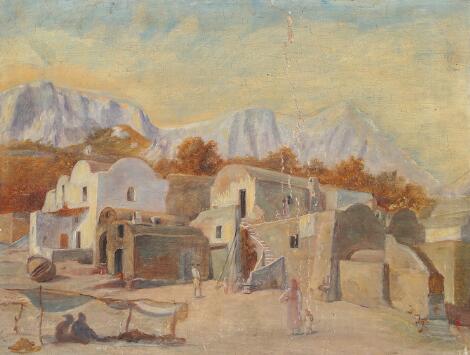 Dansk maler, 19. årh. : Sydlandsk parti med udsigt til bjerge. Sign. JF. Olie på lærred. 29 x 38.