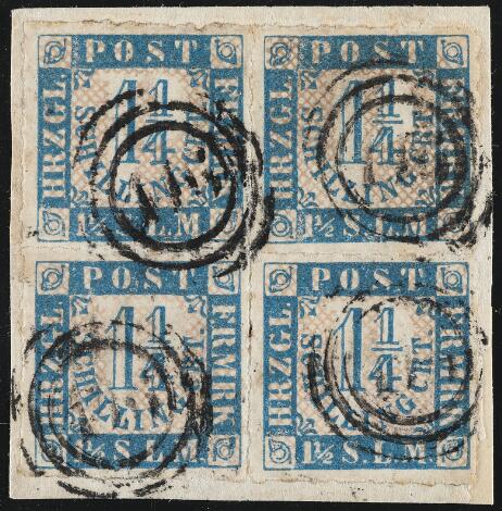Schleswig-Holstein. 1864. 1 1/4 Schilling. Very fine block of 4 cancelled 116 "GLÜCKSTADT". Cert. LN