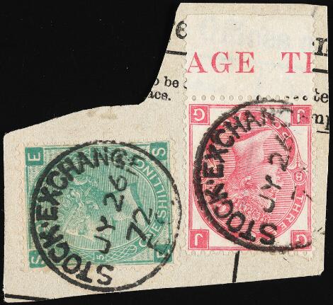 1898. 1 s. "Stock Exchange" Forgery pl. 5 with IMPOSSIBLE LETTERS SE/ES. Very fine used copy on small piece with genuine 3 d. stamp rose with sheetmargin. SUPER