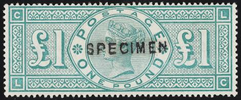 1887-92. Victoria, £1, green, SPECIMEN. Fine unused copy. Ironed out crease horizontal.
