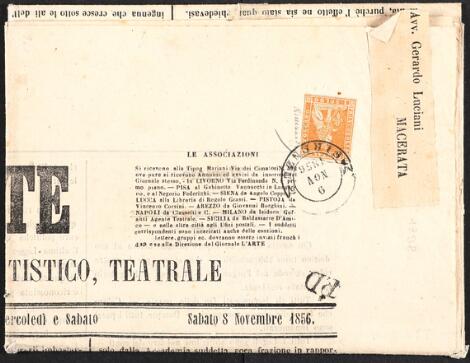 Toscana. 1853. 1 S, yellow, grey paper, wmk. Crown and Lines. Very fine copy, just touched one corner, on complete newspaper L'Arte 8.11.1856 cancelled 9. NOV.