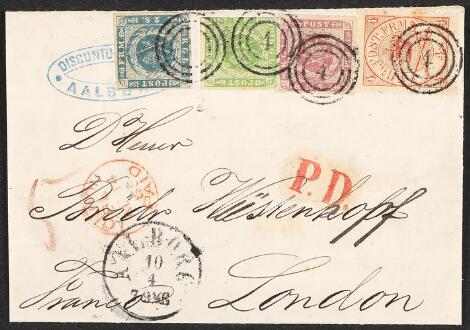 1854. 16 sk. grey-lila (pair) and 4 sk. brown 1858 (pair). Totally 40 sk. on cover to London 10.8.1861. Very rare. Daka +20.000. Certs. Nielsen and Møller
