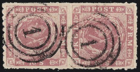 1863. 16 sk. rose lilac. Pair pos. 61-62 with variety "EXTRA FRAME LINE IN SE". Excellent item. Cert. Møller BPP "A scarce stamp with a very rare variety"