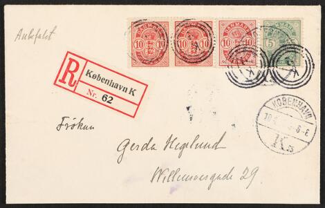 1884. 10 øre, red. Strip of 3 incl. one stamp with SMALL FIGURES + 5 øre, green with small figures on locla REC-cover in København. Very rare item. Cert. Kaiser