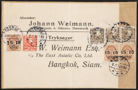 1904. 3 x 15/24 øre incl. variety "CUT 5" + Chr.IX, 10 øre and 25 øre in a strip of 3. Totally 130 øre on address-label from a large bundle of printed matters