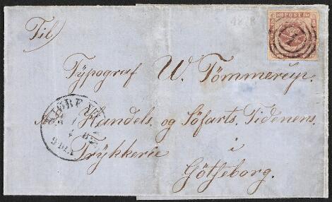 1864. 4 sk. Red. Single on beautiful gold ornimated cover cancelled from SKIVE 12.3. (1869) to Frederikshavn 13.3.1869. Stamp with some perf. faults. Very rare