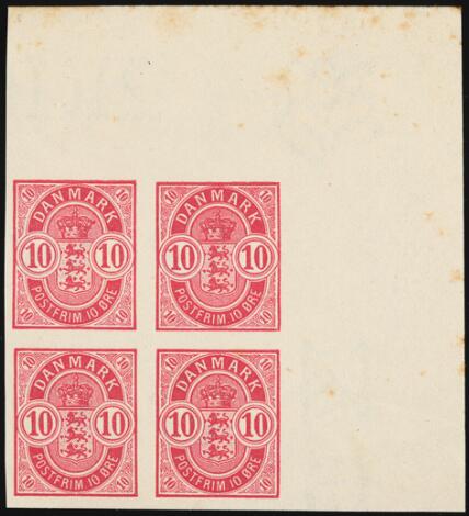 1884. 10 øre, aniline. IMPERFORATED BLOCK OF 4 with full upper corner margin. All 4 stamps are MNH (hinged in margin only). ONLY KNOWN COPY. AFA 20.000++