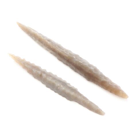 2549/350Two Danish Neolithic grey flint arrow head. Pitted Ware culture. L. 7.7-9.7 cm. (2)