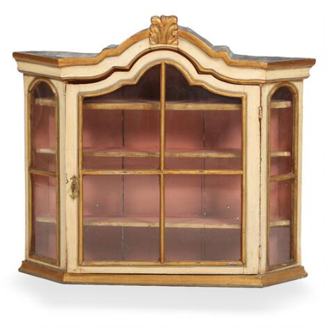 2549/285An 18th century painted and partly gilt wood Rococo hangning cabinet. H. 82. W. 97. D. 27 cm.