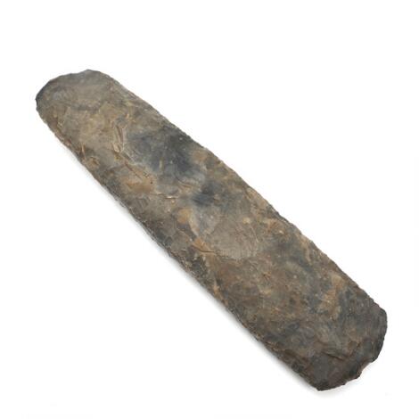 2549/329A fine Danish Neolithic thin butted greyish flint axe with "stiches" on all four edges. L. 30.5 cm.