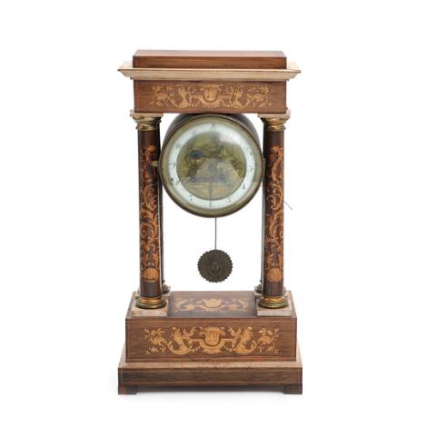 2549/282A 19th century Empire style rosewood portico clock with intarsia. H. 43.5. W. 24. D. 13 cm.
