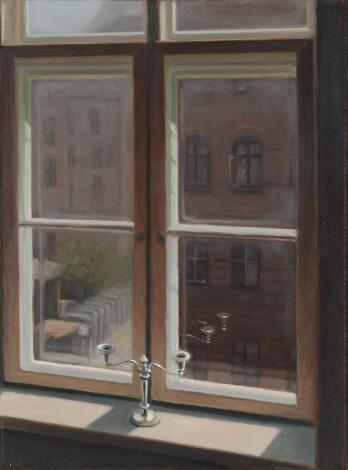 2549/529Ulrik Møller: "Vindueskarm m. lysestager", 2000. Signed on the reverse with title and date. Oil on canvas. 40 x 30 cm.