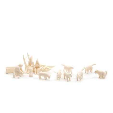 2548/9074AarhusA carved walrus tusk figure group with dogsleigh, primus box, tools, three persons with seven dogs. Sleigh L. 14 cm. (19)