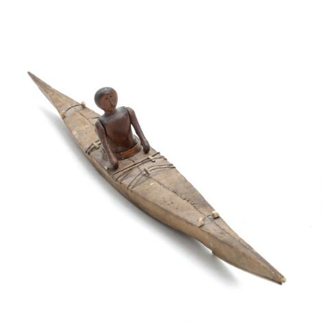 2548/9063AarhusModel kayak made of patinated leather and bone with a carved wooden figure. Early 20th century. L. 72 cm.