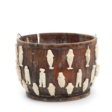 2548/9000AarhusA Greenlandic driftwood water bucket, decorated with bone carvings. Early 20th century. H. 17. Diam. 13 cm.