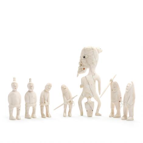 2548/9068AarhusA collection of seven Greenlandic carved narwhale tupilaks. 20th century. H. 2.5-8.5. Fabulous monster L. 17 cm. (7)