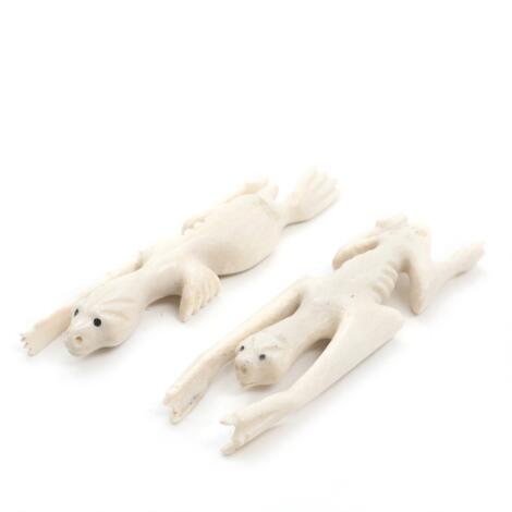 2548/9083AarhusTwo tupilaks of carved bone in the shape of crawling seals. L. 14 - 15 cm. (2)