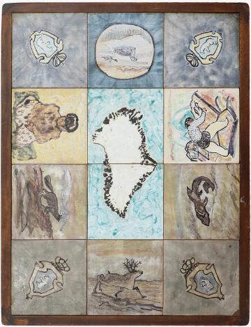 2548/9064AarhusA polished wood tile table, top with 12 ceramic tiles with Greenlandic motifs. 20th century. H. 63. W. 64.5. D. 49 cm.