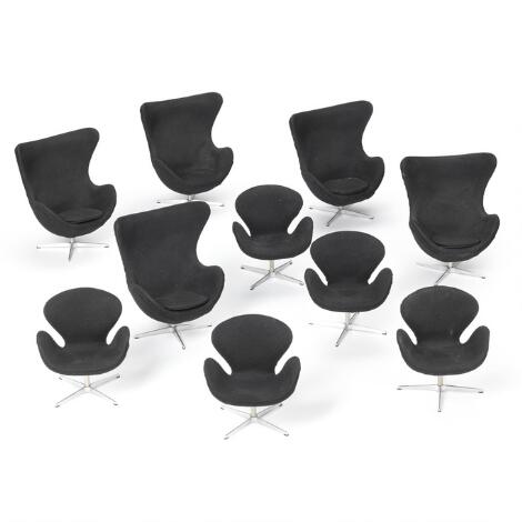 332/74LyngbyArne Jacobsen: Miniaturemøbler med stel af stål bestående af fem styk "Ægget" og fem styk "Svanen". (10)