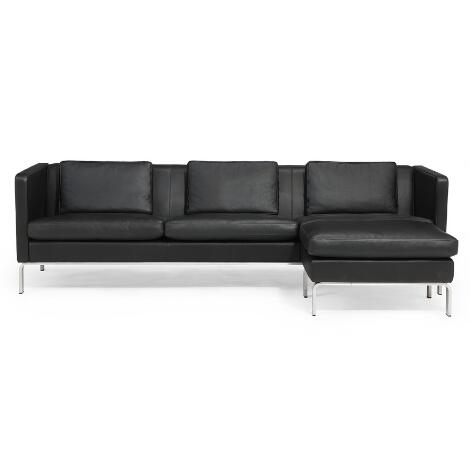 332/66LyngbyTre pers. sofa og skammel med stel stål. Betrukket med sort skind. (2)