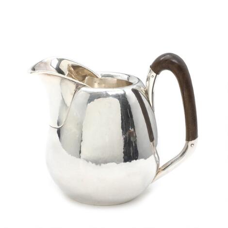 2550/694Karl Gustav Hansen: Hammered sterling silver milk jug with sweeping wooden handle. Hans Hansen 1948. Weight 315 gr. H. 10,5 cm.