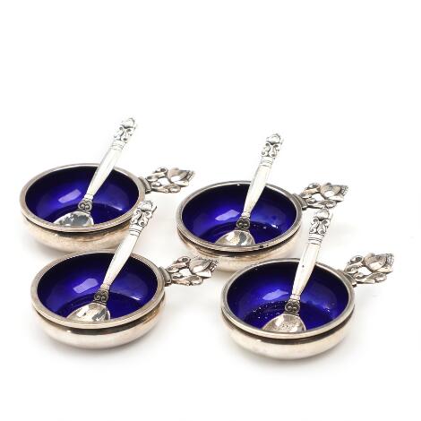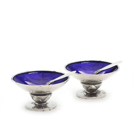 2550/689Gundorph Albertus: "Cactus". A pair of sterling silver salt cellars decorated with blue enamel and a pair of salt spoons. Georg Jensen. (4)