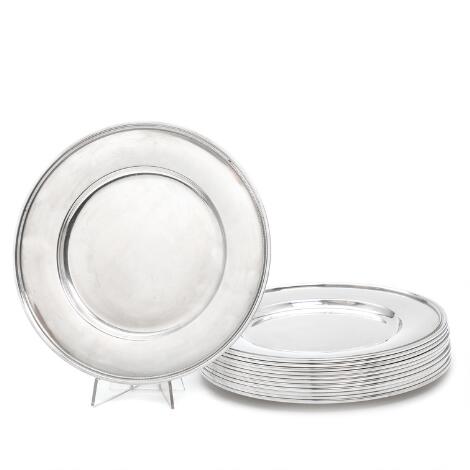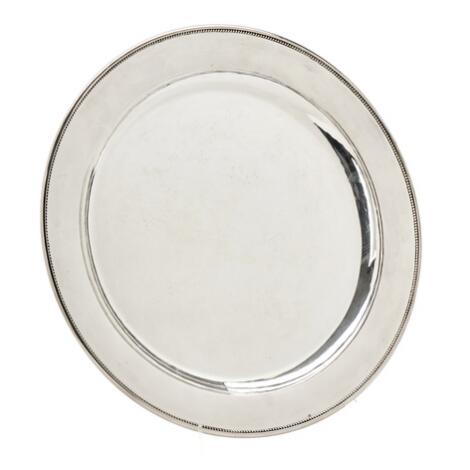 2550/724Boy Johansen: A set of 12 sterling silver charger plates, profiled rim with beading. 20th century. Diam. 29 cm. (12)