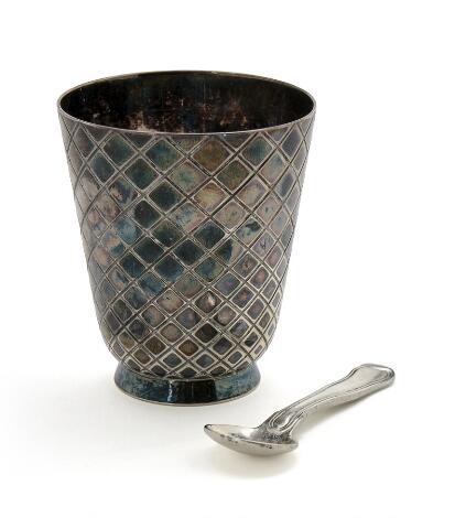 2550/702Sigvard Bernadotte, Harald Nielsen: A sterling silver cocktail goblet with engraved harlekin decor. Accompanied by an "Old Danish" salt spoon. (2)