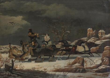 2551/103LyngbySophus Schack: "Reisende, forfulgt af Ulve". Sign. monogram 1838. Olie på lærred. 99 x 134 cm.