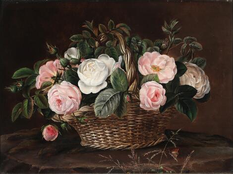 2551/133LyngbyI. L. Jensen, skole, 19. årh.: Opstilling med roser i en kurv på en træstub. Usigneret. Olie på træ. 30 x 40 cm.