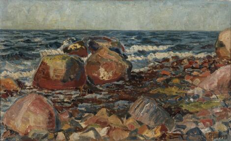 2551/31LyngbyJohannes Larsen: "Store sten paa Sprogø Strand". Sign. monogram 1913. Olie på lærred. 58 x 94 cm.